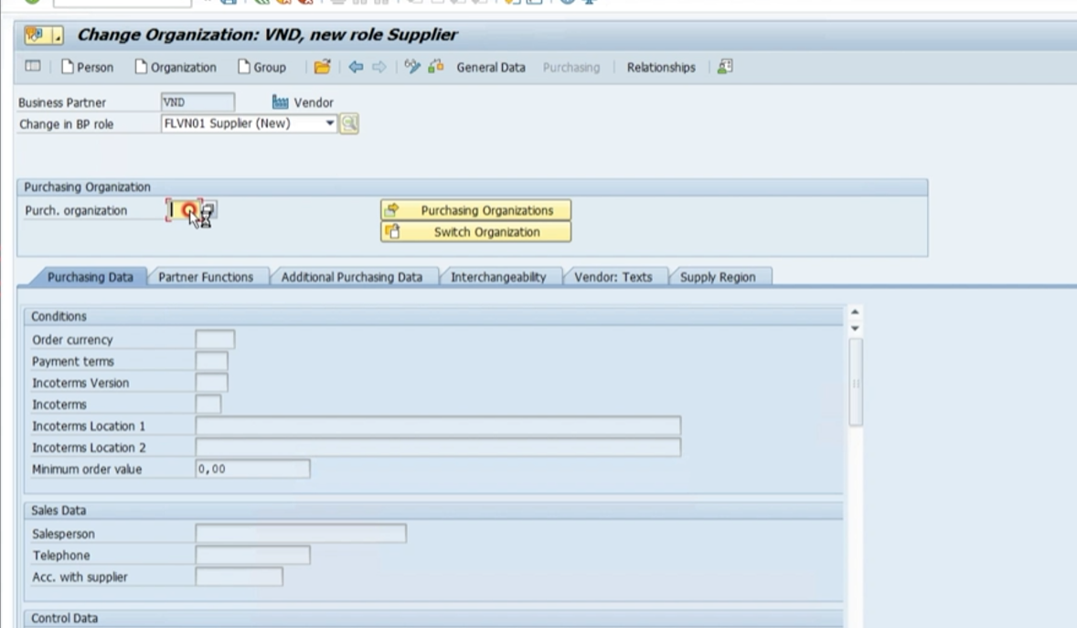- 구매관련 데이터 입력, 구매조직 반드시 입력, 통화키 인코텀즈(인도조건) 등 입력