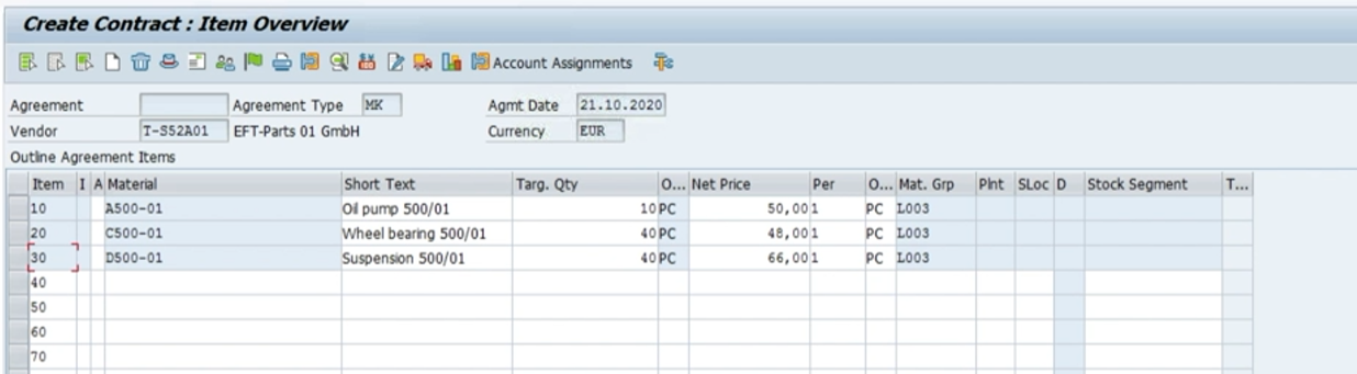 - Quantity contract : MK 계약기간동안 얼마만큼의 수량을 계약할건지, 해당 자재별로 수량을 관리해 목표 수량을 아이템 레벨에서 관리