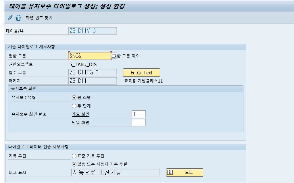 유지보수 뷰를 만들거기때문에 유지보수 생성기에서 다이얼로그를 생성해준다. 펑션 그룹도 직접 만들어 넣어주었다. 화면은 상단의 화면번호찾기를 눌러주면 적절한 화면을 알아서 찾아서 넣어준다.