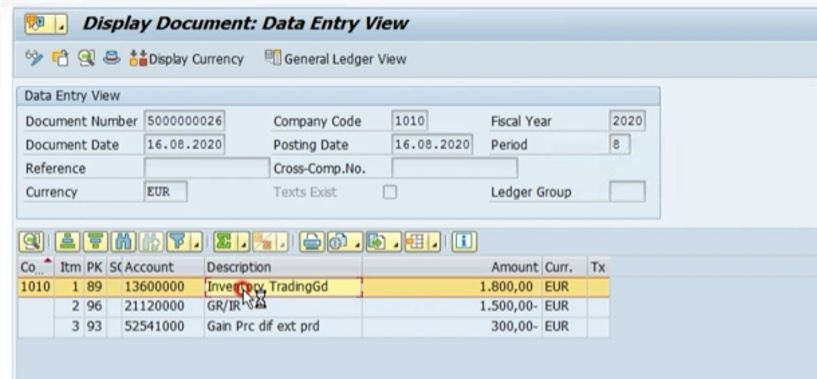 FI문서 조회해보면, 재고자산계정이 차변에 기표된걸 알 수 있다.