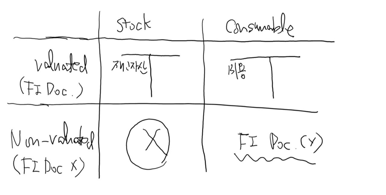 - 재고자산의 경우와 입고시점의 계정 결정에만 차이가 있다. 재고자산의 경우 재고계정이 들어오는데 소모성자재의 경우 Consumption acc 계정의 차변에 GR 130 들어온다.